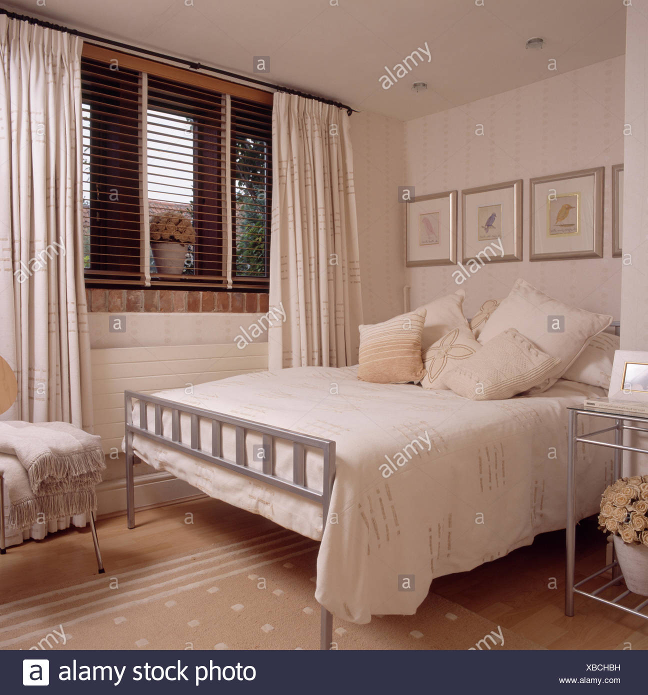 Coussins Creme Et Couvercle Sur Metal Simple Lit Dans Chambre A Coucher Moderne Avec Des Rideaux Creme Et Jalousie Sur La Fenetre Photo Stock Alamy from c8.alamy.com